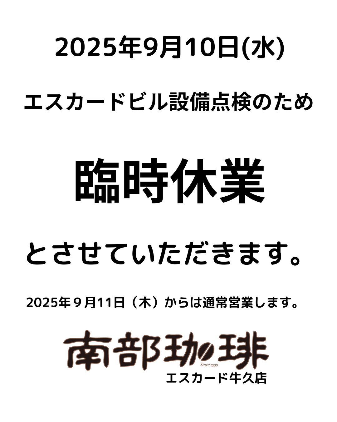 南部珈琲エスカード牛久店は、2025年9月10日(水) ビル設備点検により、臨時休業とさせていただきます。 -