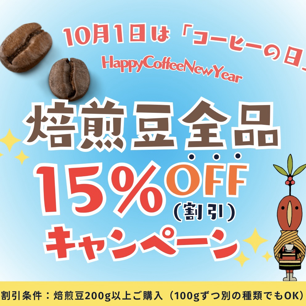 「10月1日はコーヒーの日」焙煎豆全品15%OFFキャンペーン(10月1日~10月5日)